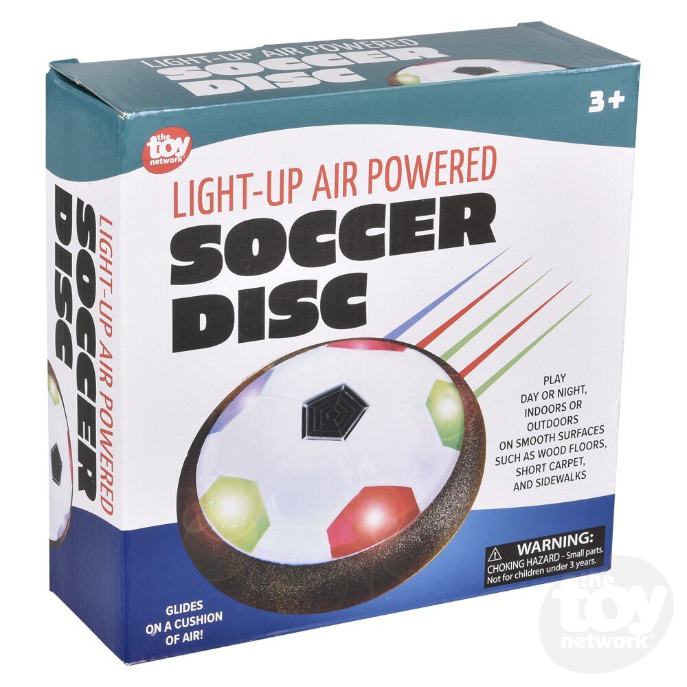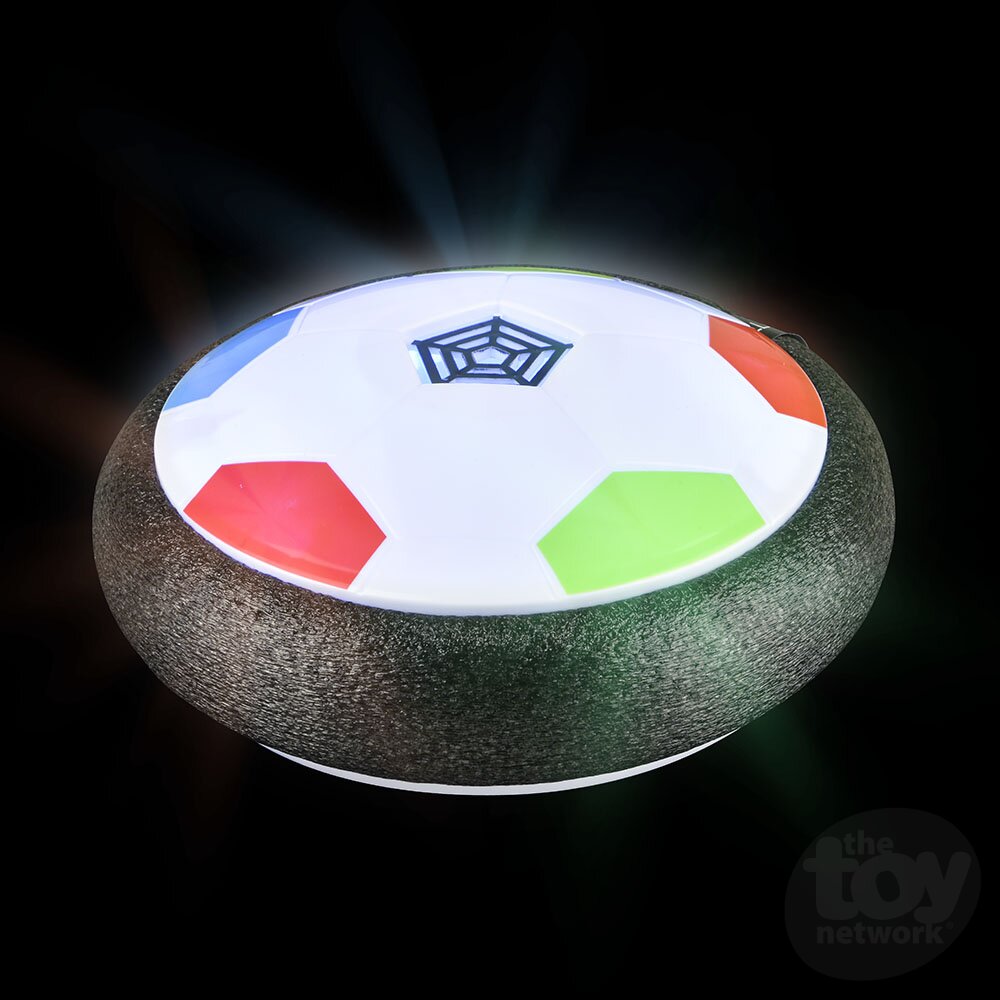This Glow Air Power Soccer Disc hovers across many different surfaces. Its soft bumpers bounce off objects and protects from damage indoors and outdoors. Requires 4 x AA batteries.