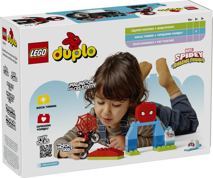 • Creative toy packed with play starters – Includes a LEGO® DUPLO® Spin figure, a drivable motorbike toy, a build-and-rebuild toy HQ and ramp, a web element and a Trace-E robot spider brick