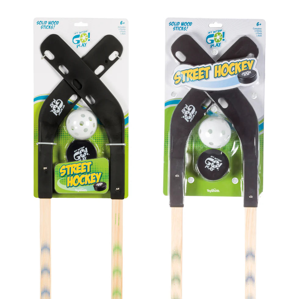 Play hockey year-round with this bestselling street hockey set from Get Outside Go! for 2 players. Each set includes 2 hockey sticks, 1 black hockey puck, and 1 white Wiffle ball. Hockey sticks are made of real wood and measure 47.5 inches long with hard black plastic ends.