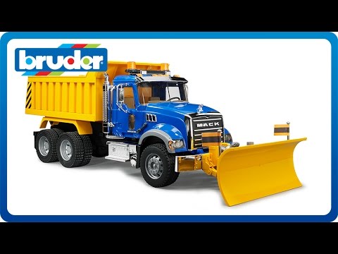 MACK Granite Dump Truck with Snow Plow features an incredibly realistic driver's cabin, opening doors, a tilting engine hood, foldable rear-view mirrors and the many add-on accessories that give it its chrome look. snowplow
