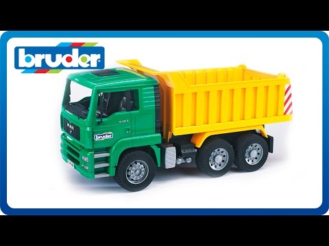 This MAN Dump Truck is designed like thing real thing. Its features include a forward tilting cab for view of the engine block as well as foldable side view mirrors. The cargo bed tilts up and rear gate opens to unload, making it the greatest toy in the sandbox! The soft rubber-like tires are treaded and ready for play.