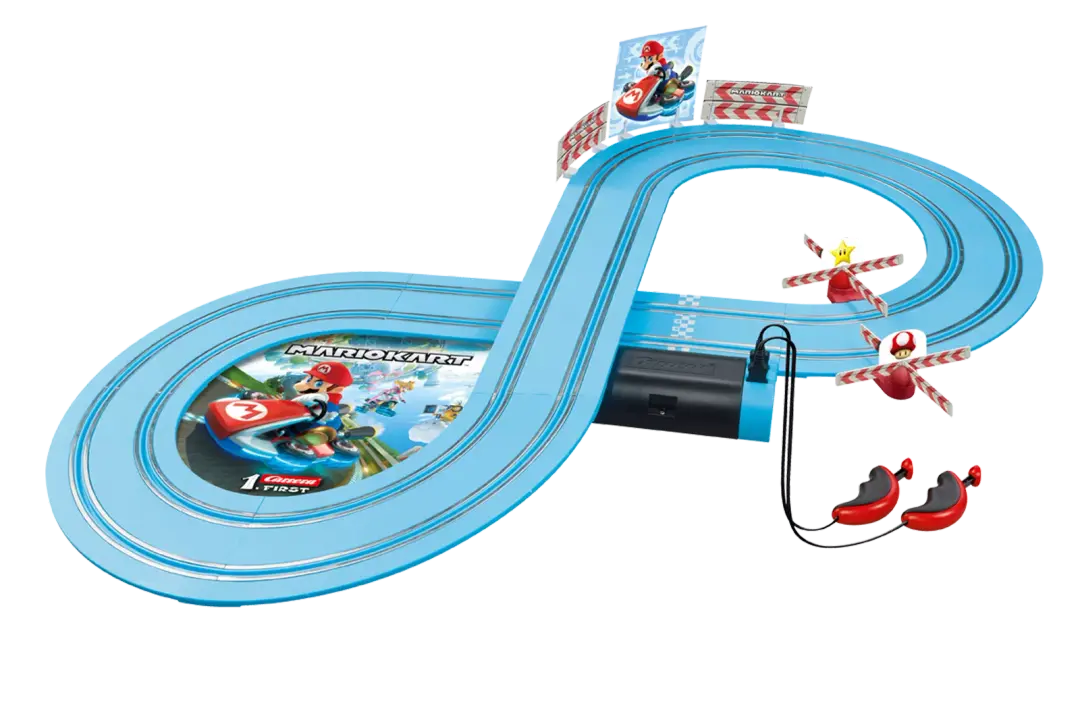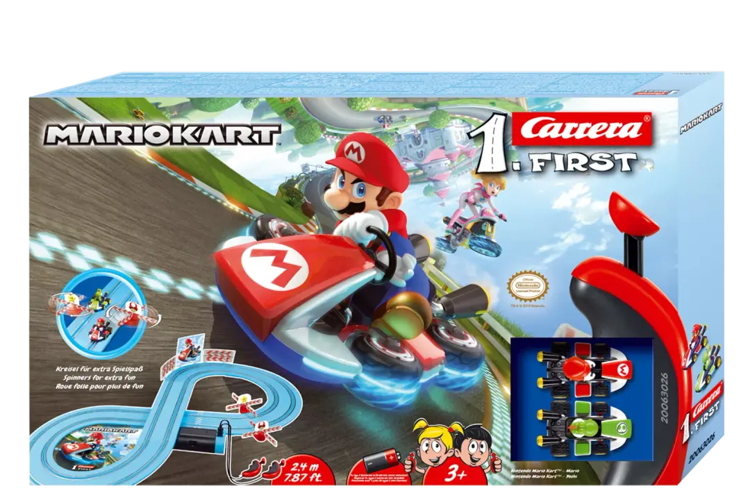 Children as young as 3 years old can now grab the controls and speed around this kid-friendly racetrack! Race with your favorite characters Mario and Yoshi from the Mario Kart™ video game series. Each Carrera FIRST slot car racing track set features a fun themed setting on a track built around their favorite TV show, movie, or video game characters. Your child will find staying on the track easy with the electronically regulated speed controllers allowing them to race non-stop in head-to-head action against their friends or siblings.