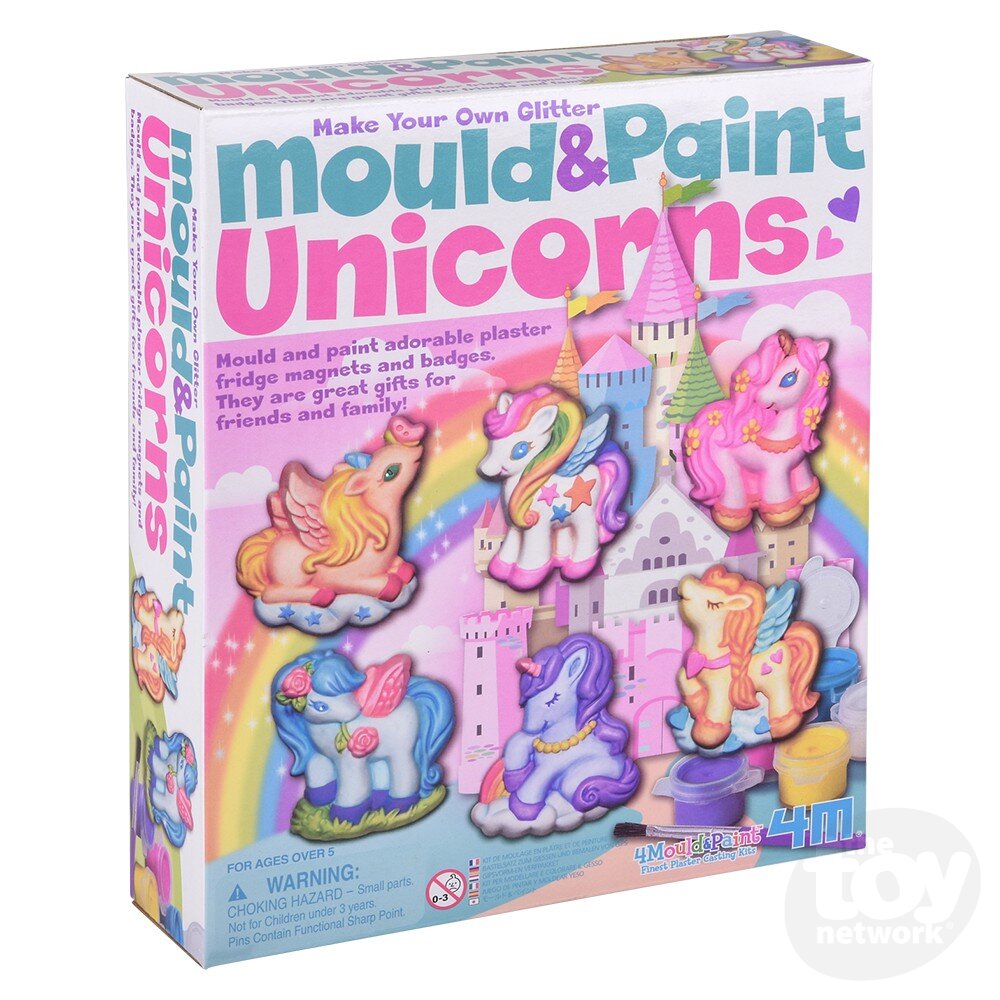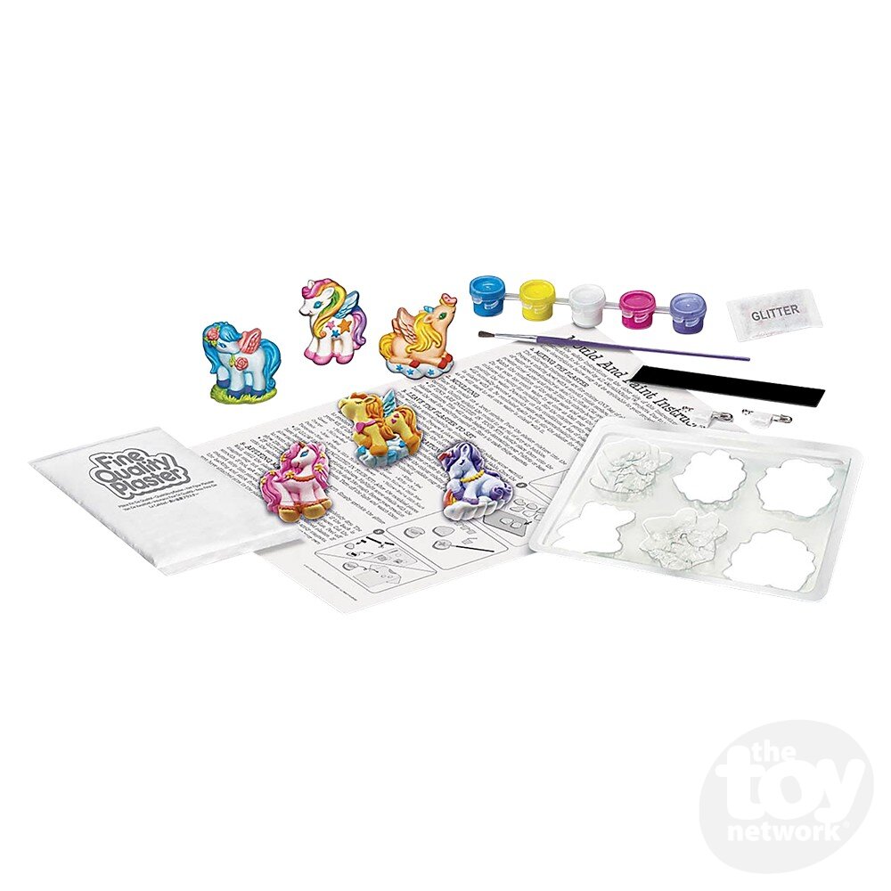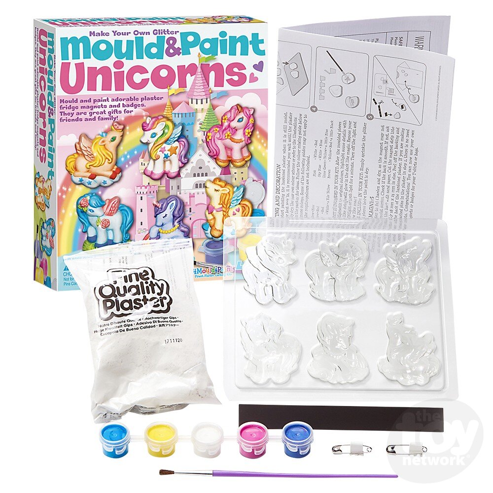 This Mold And Paint - Glitter Unicorns kit has users insert plaster into the unicorn molds, and paint it when dried. Includes plaster, paint, molds, paintbrush, and instructions.