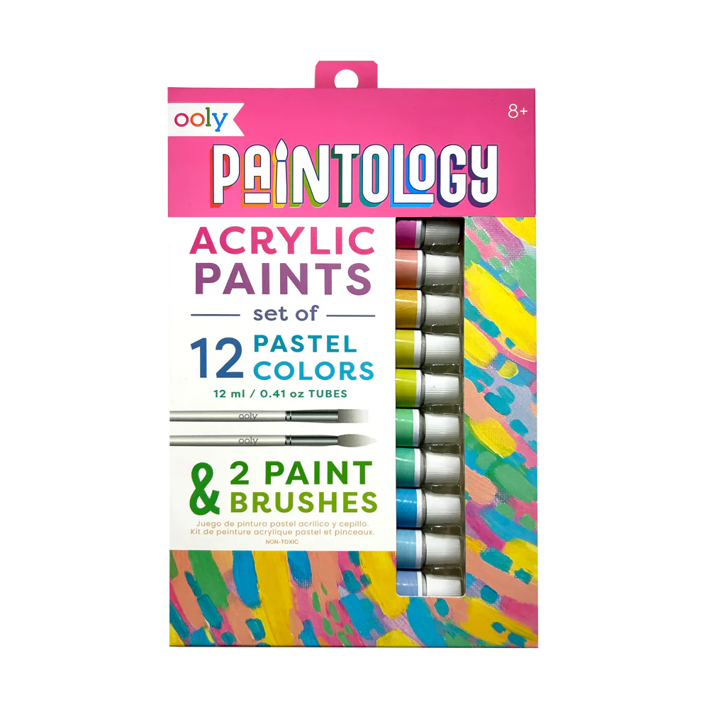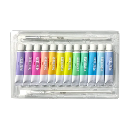 - Kit includes 12 acrylic pastel colored paint tubes, 2 paint brushes (one thin and one broad)