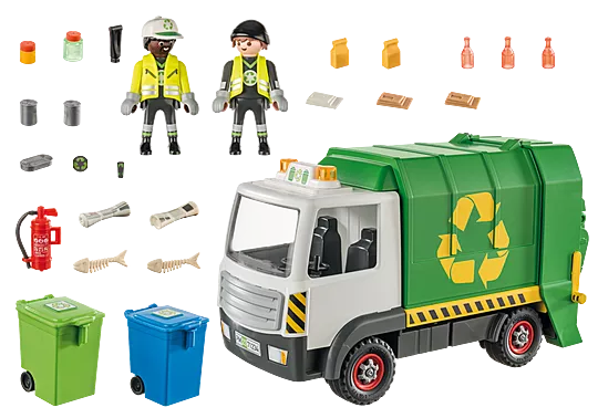 Help keep the city clean with the PLAYMOBIL Recycling Truck. This PLAYMOBIL City Life Recycling Truck comes with many realistic features, such as two bins and lots of garbage to collect and recycle. Help the sanitation workers to load the bins on the back of the truck and then pull the lever to lift and empty each container. To empty the vehicle, the entire container is tilted up and the rear attachment is lifted. Easily access the driver's cab thanks to the removable roof. Two members of the sanitation department can ride in the vehicle. Just like the real thing: The figures can stand on the left and right at the rear of the vehicle, holding on to the grab handle while driving. Includes 2 PLAYMOBIL figures. Dimensions: 10.6 x 4.7 x 6.4 in (LxWxH) Recommended for ages four to ten years. Warning. Choking Hazard. Small parts. Not for children under 3 years.