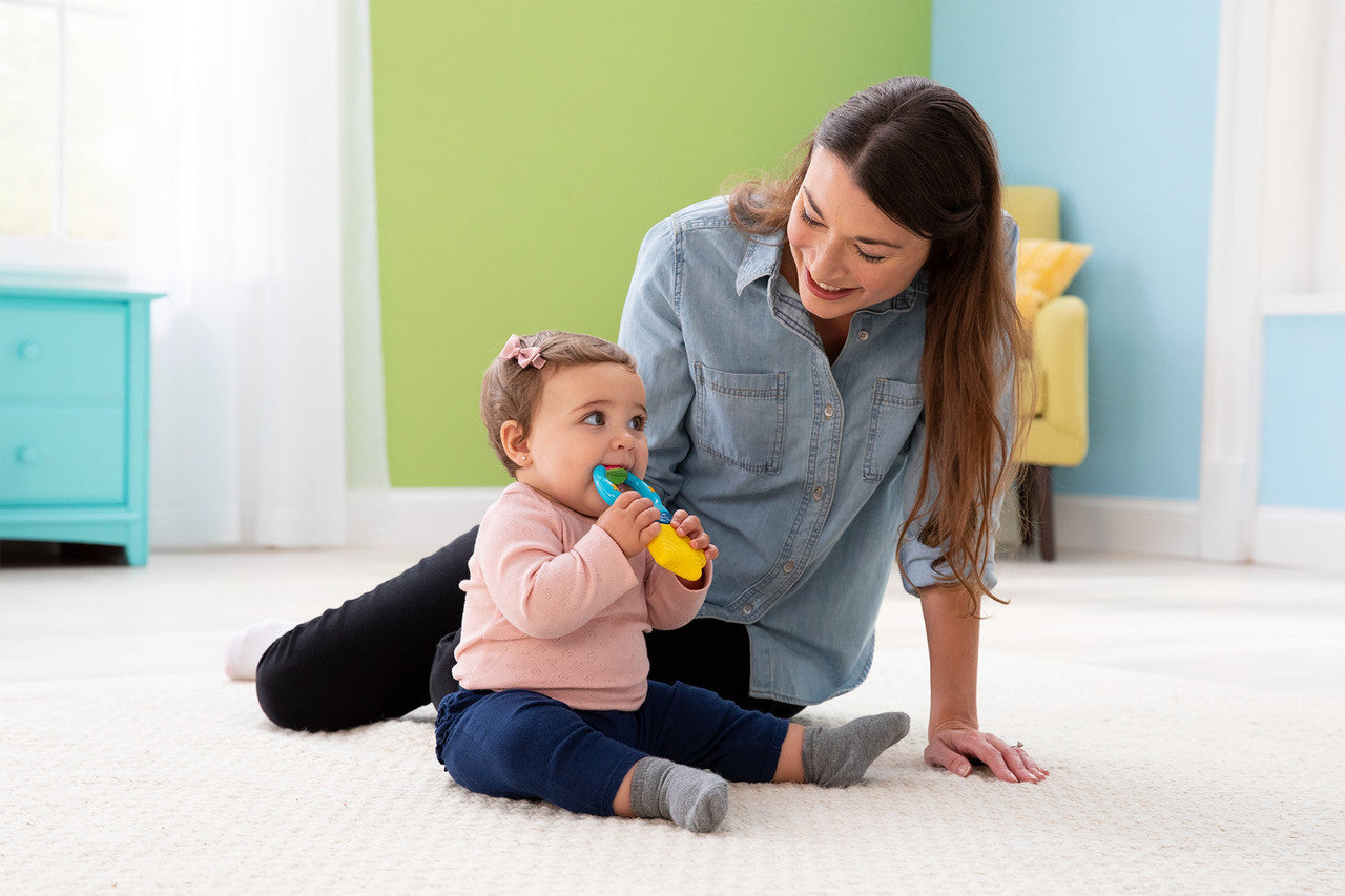 This teether will be the "star" of your baby's items, with chewable star points that produce a safe, soothing vibration whenever baby bites down on them. Powered by a small long-life battery that's sealed inside, this playful teether features an easy-grasp ring handle with spin feature for added fun. Your teething star will love it!