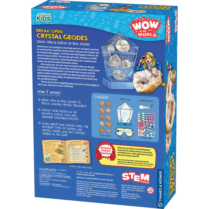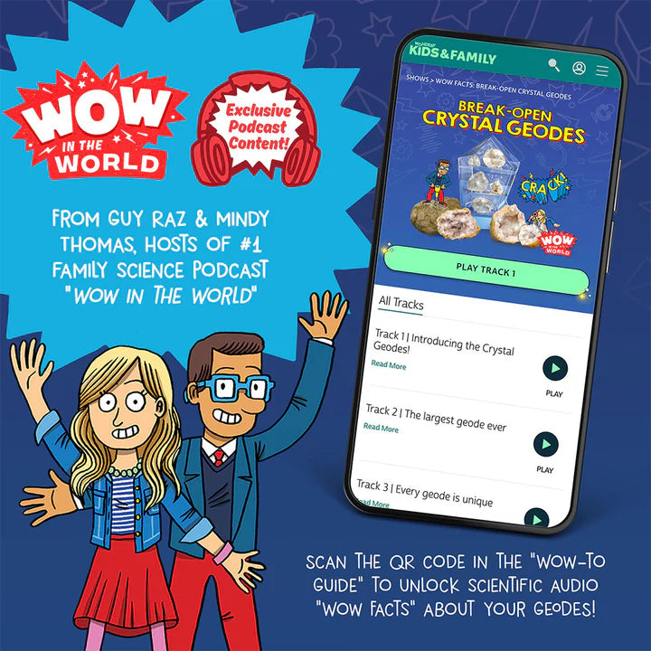 A fun, eight-page, full-color experiment guide takes you through cracking open the geodes and provides exciting educational content about these amazing natural wonders. Scan the QR code to access exclusive podcast content including scientific info about how geodes form and fascinating facts about geodes, all explained by Wow in the World’s Guy Raz and Mindy Thomas! The kit also includes a magnifying glass and a pair of safety goggles to add to your collection of classic STEM tools.